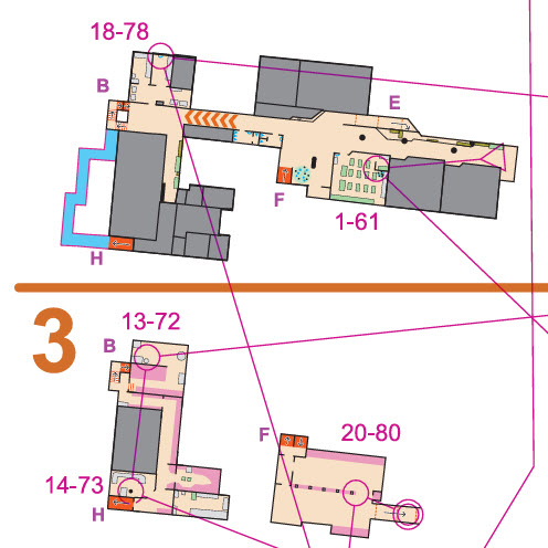 ... Nach dem dritten Posten musste aber auch ich ein erstes Mal ein wenig länger stehen bleiben, um den Weg zum vierten Posten via ein anderes Stockwerk zu finden. Und es wurde nicht besser: Nachdem ich zu zwei weiteren Posten überhastete Routenwahlen getroffen hatte, bei denen ich auf einmal vor einer Einbahn stand oder der Weg sonst versperrt war, dämmerte es mir langsam, dass es vielleicht gar keine so schlechte Idee war, die Routenwahl sitzend auf einem Sofa durchzudenken. Aber auch sitzend war es nicht immer einfach, eine gescheite Route zum nächsten Posten zu finden: Über welche Treppe muss ich in die Turnhalle hinunter, so dass ich dann zum richtigen Ausgang ...